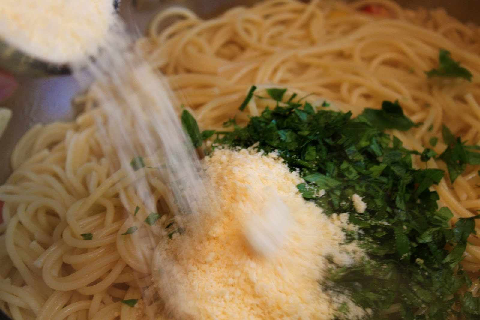 Now, add one cup of fresh Parmesan and fresh chopped Italian parsley. Pretty. On a whim, I added some lemon zest to the pasta, to complement the shrimp.